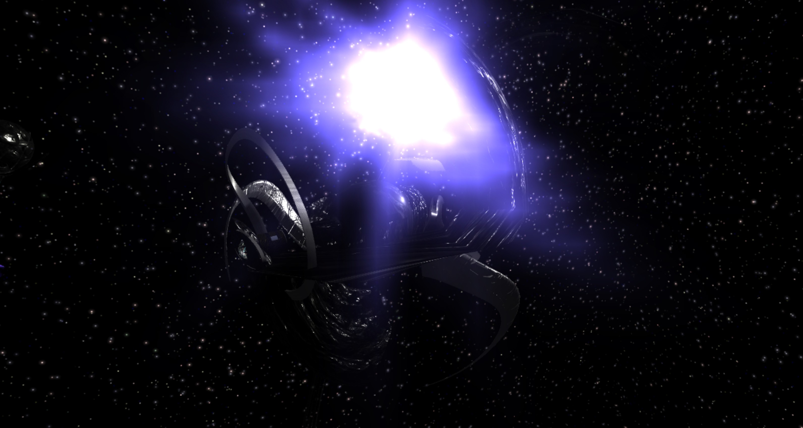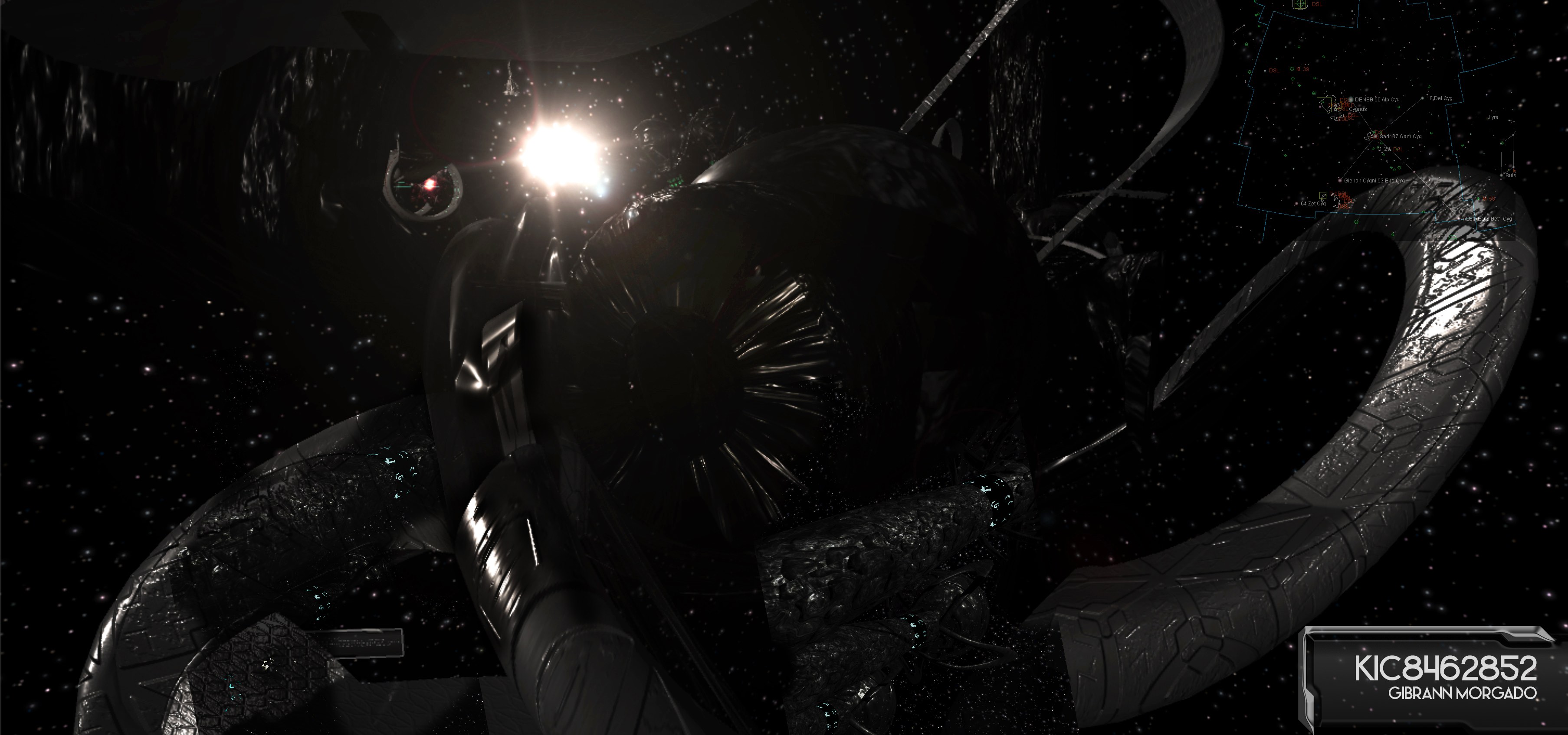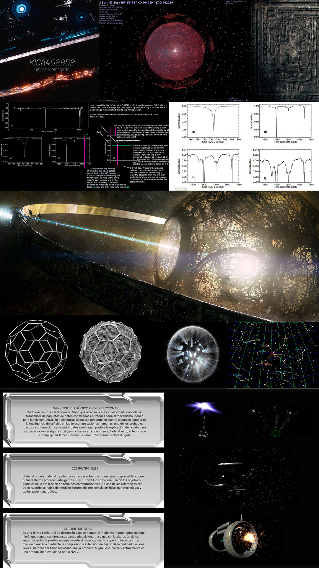 The simulation explores a theoretical Dyson Sphere — a hypothetical megastructure proposed by physicist Freeman Dyson that would encompass a star to capture most or all of its energy output. In my artistic interpretation, this massive construct is populated with speculative advanced technologies that might justify such extraordinary energy harvesting: a computronium (dense substrate of matter that intelligently processes information, hypothesized by Margolus and Toffoli in 1991), the Alcubierre drive (a mathematically demonstrated concept for spacetime deformation), and an omnidirectional electromagnetic pulse emitter encoding messages through light, among others.