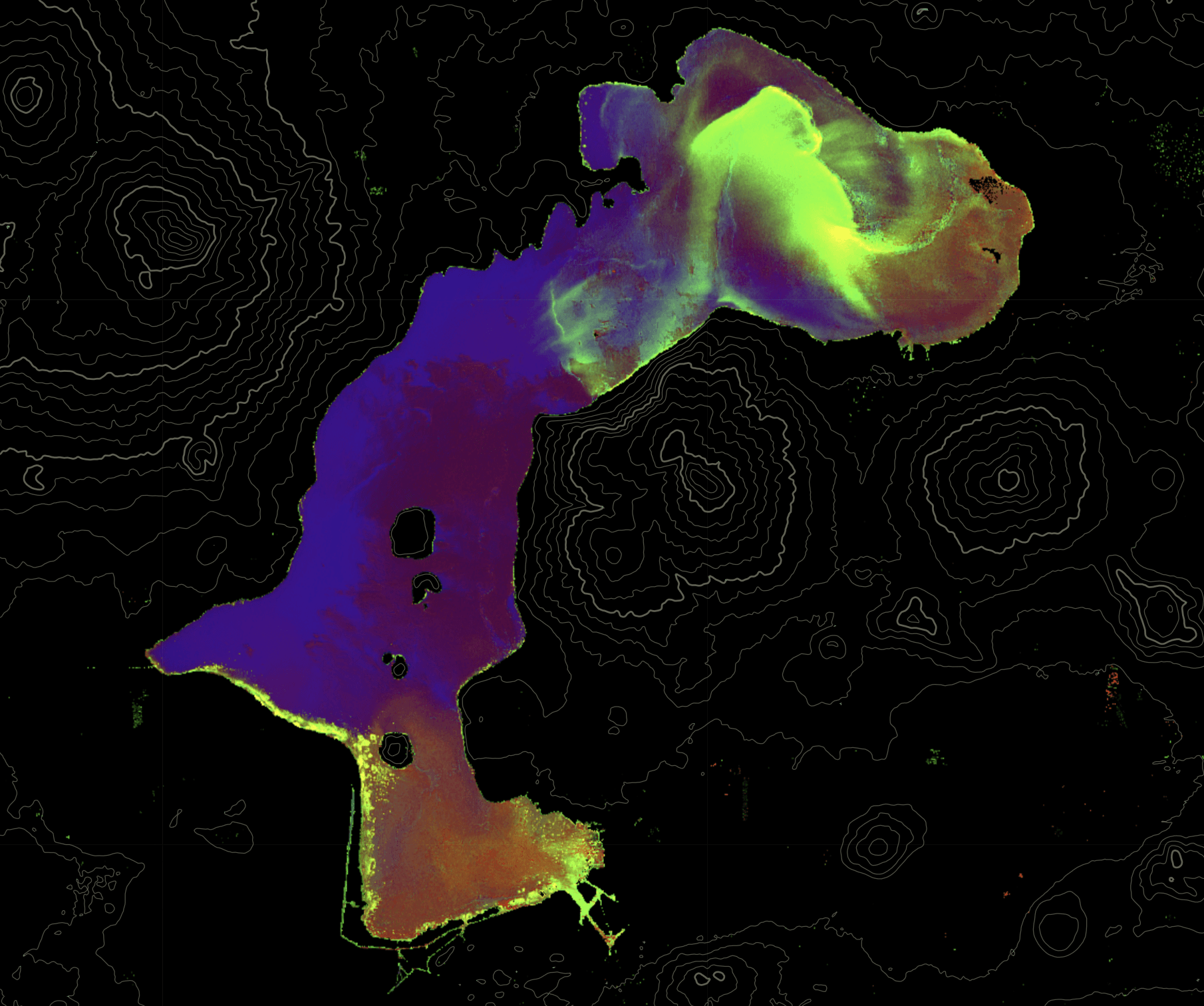 This project is a software system that leverages multispectral satellite imagery to estimate a range of critical environmental parameters, particularly for bodies of water. Thanks to data from Earth observation satellites and field data samples, the software analyzed and monitored critical indicators such as the trophic state of water, turbidity, dissolved oxygen levels, surface temperature, sediment content, harmful algae blooms, total suspended solids and oil spills.